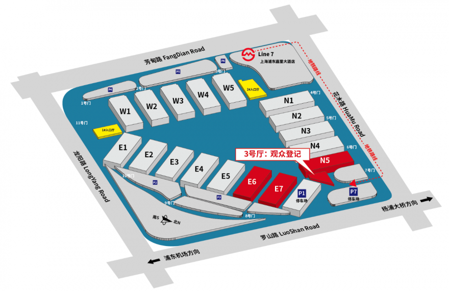 網約車/出租車:請定位“上海新國際博覽中心3号入口大廳”下車(位于花木路與羅山路交叉口,或導航:上海新國際博覽中心7号門)。