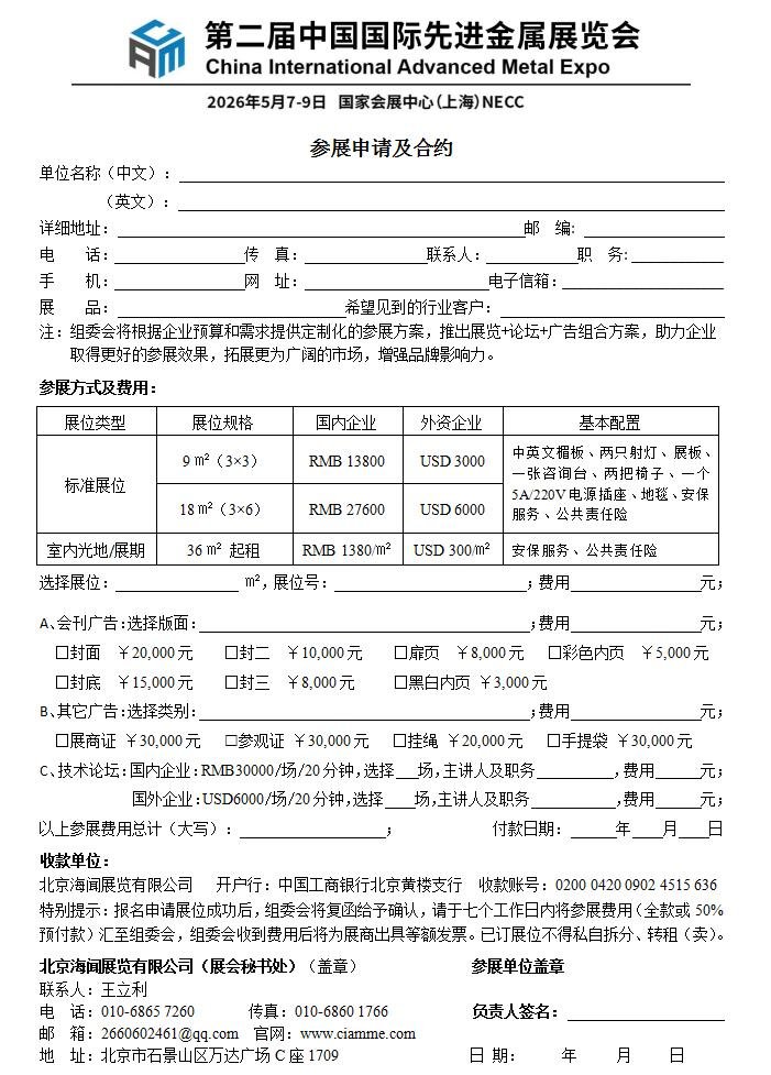 當前,全球科技創新空前密集活躍,颠覆性技術和重大成果競相湧現,以人工智能、基因工程、新材料、量子科技等領域的新突破與應用為主要标志的第四次科技革命正在席卷全球,持續催生先進金屬應用的新場景新生态。為推動先進金屬產業資源整合與全球聯動發展,促進產業上下遊協同共進,深化產學研用一體化融合,壯大行業增長新動能,塑造國際競争新優勢,打造產業鏈國際化布局的戰略支點,第二屆中國國際先進金屬展覽會(CAME2026)将于2026年5月7-9日在國家會展中心(上海)舉辦。本屆展會将聚焦前沿技術突破與跨行業融合創新,彙集中外全產業鏈及終端應用領域優質資源,全面展示先進金屬產業的領先產品、技術和解決方案。誠邀海内外業界同仁相聚滬上,同繪行業可持續發展新藍圖,共啟高端制造新時代!