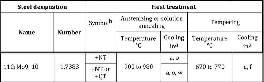 QT= quenched and tempered; NT= normalized and tempered. a = air; f = furnaced; o = oil; w = water or water based medium.