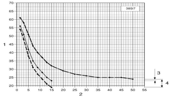 圖中:1-硬度HRC;2-離開淬火端的距離/mm;3-HH等級;4-H等級