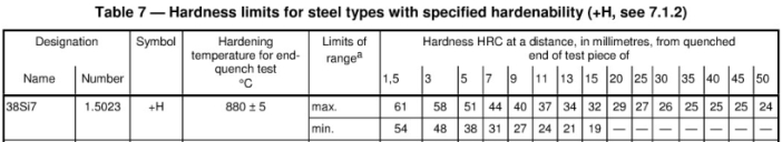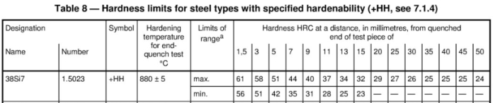 淬透性帶範圍(H/HH)、離開淬火端的距離/mm、硬度HRC的關系圖